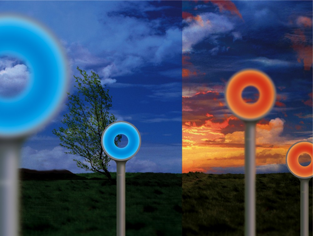Drawing on peoples’s affinity with nature, Light Chimes detect changes in the breeze and temperature and translate them into captivating pattens of swirling light. Light Chimes blur the boundaries between the interior and exterior of the home, making the invisible visible through the medium of light. Although they appear to be a group of lights, each chime reacts individually to the elements, thus creating random pattens of light. Position the light Chimes so that their build-in sensors make the light glow more intensely when a breeze passes through them and their colors changes in response to the temperature. When a number of Light Chimes are places together in a garden, you can literally ‘see’ the breeze pass through them. And when the temperature rises, the color of the light grows ‘cooler’; when it decreases, the light grows ‘warmer’.