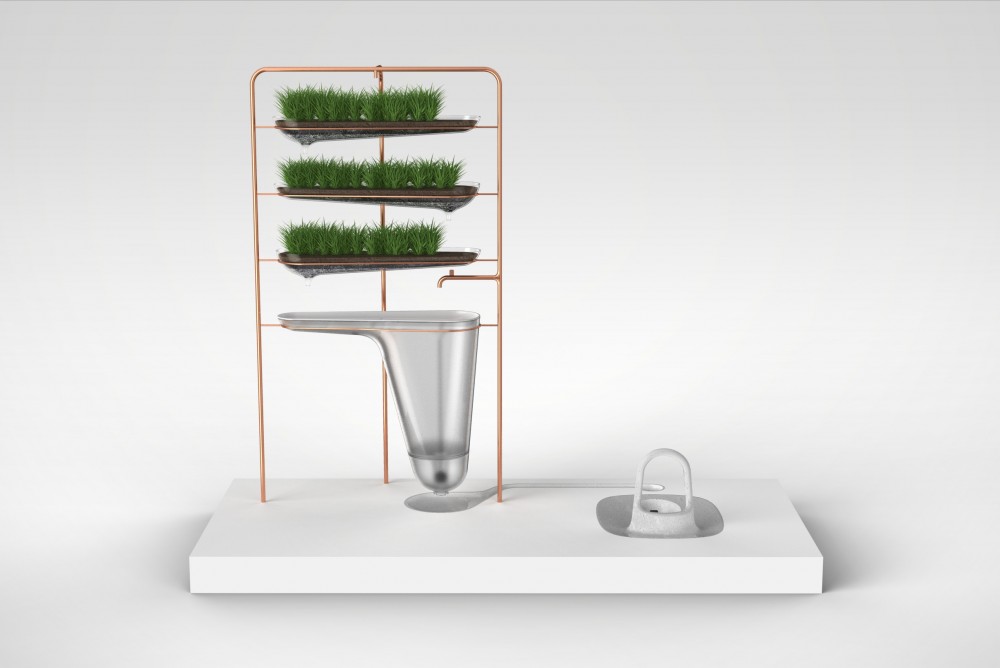 A waste separating squatting toilet that filters effluent while channeling excreta to a methane digester in the Microbial Home system. The concept of the filtering squatting toilet incorporates a handrail to support a person (and improve comfort) in the squatting position. The filter array, comprised of charcoal, sand and ceramic filters, supports a range of plants to clean effluent. The flush mechanism is based on the 1 litre flush toilet technique developed by the Sulabh Foundation in India.The concept is sustainable and ecological. It uses no energy, is water saving and non-polluting. The system is designed to show the energy value in human waste and raise awareness about wasting water. It provokes discussion and evaluation of toilet taboos and ablution habits. It draws attention to the necessary systemic shift from utility dependent sanitation systems to regenerative localized solutions that see waste as a necessary part of a domestic eco-system.
