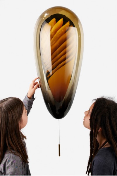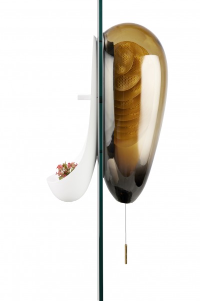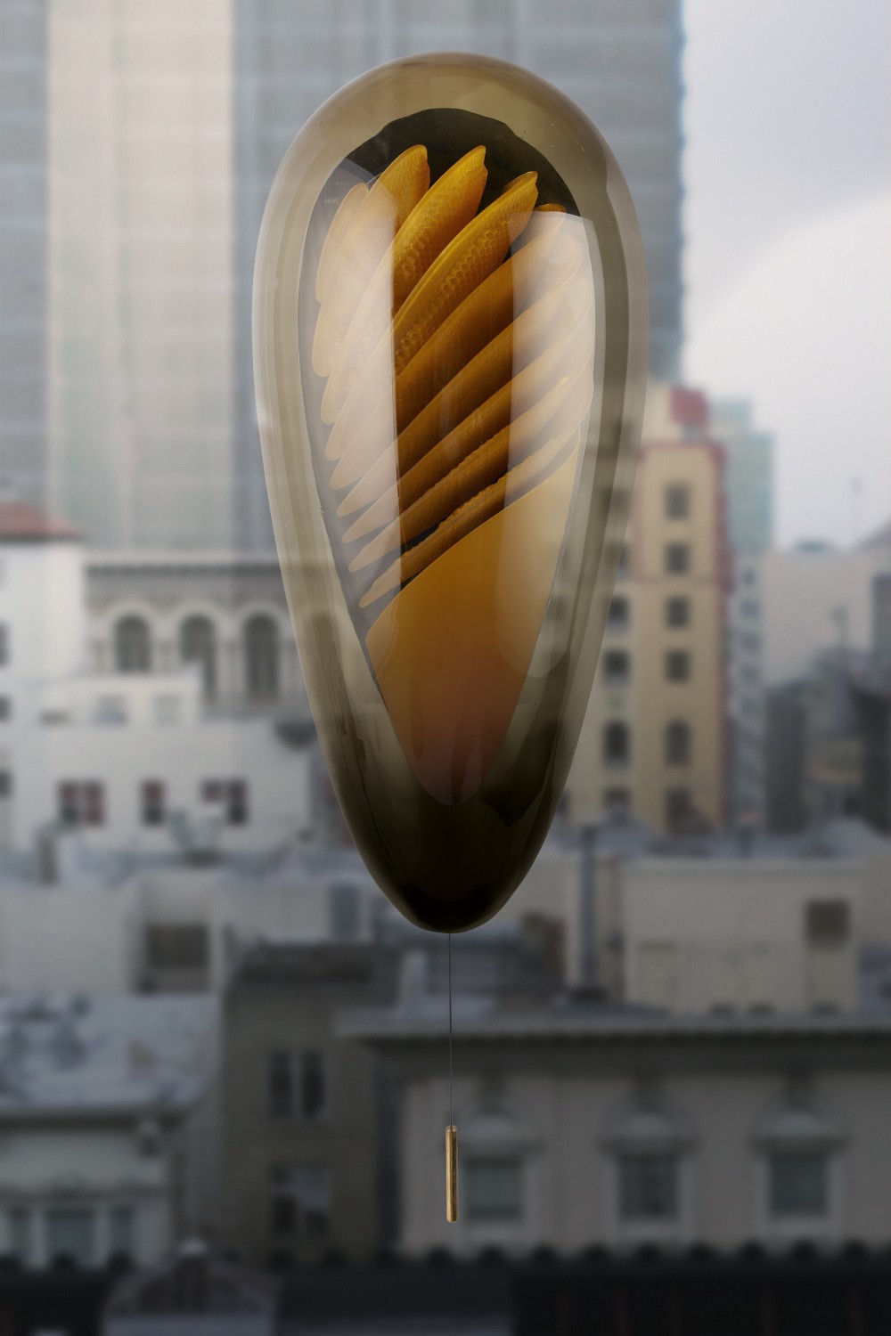 The urban beehive is a concept for keeping bees at home. The beehive is designed to allow us a glimpse into the fascinating world of these industrious creatures and to harvest the honey that they produce. The design of the beehive is unconventional, appealing, and respects the natural behavior of the bees. It consists of two parts: entry passage and flower pot outside, and glass vessel containing an array of honeycomb frames, inside. The glass shell filters light to let through the orange wavelength which bees use for sight. The frames are provided with a honeycomb texture for bees to build their wax cells on. Smoke can be released into the hive to calm the bees before it is opened, in keeping with established practice.